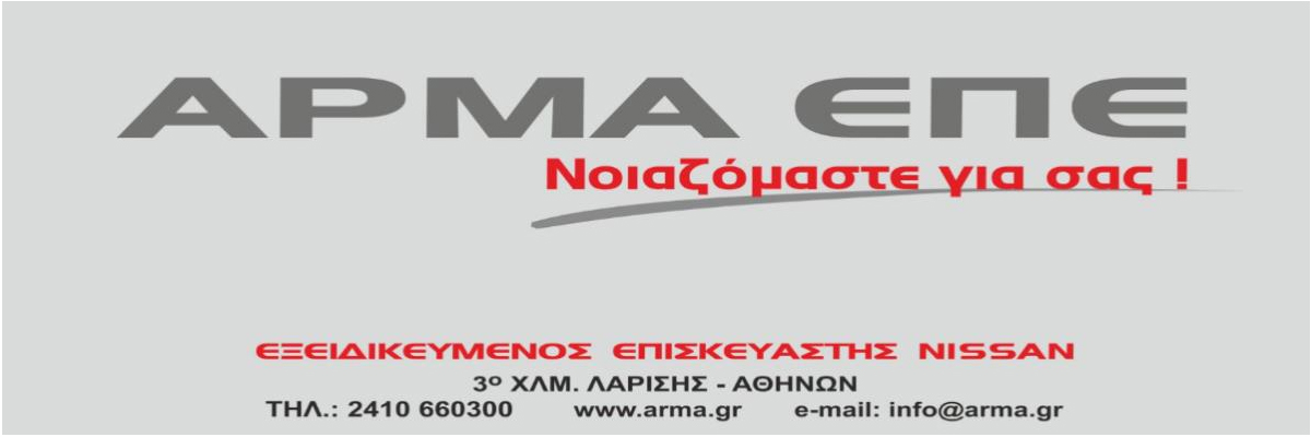 Το συνεργείο "ΑΡΜΑ SERVICE" βρίσκεται στο 3ο χλμ. Λάρισας - Αθήνας και εξειδικεύεται στα αυτοκίνητα NISSAN. Προσφέρει υψηλής ποιότητας υπηρεσίες σε ό, τι αφορά την επισκευή και συντήρηση του αυτοκινήτου σας συνδυάζοντας πολυετή εμπειρία και τεχνογνωσία στα αυτοκίνητα Nissan.